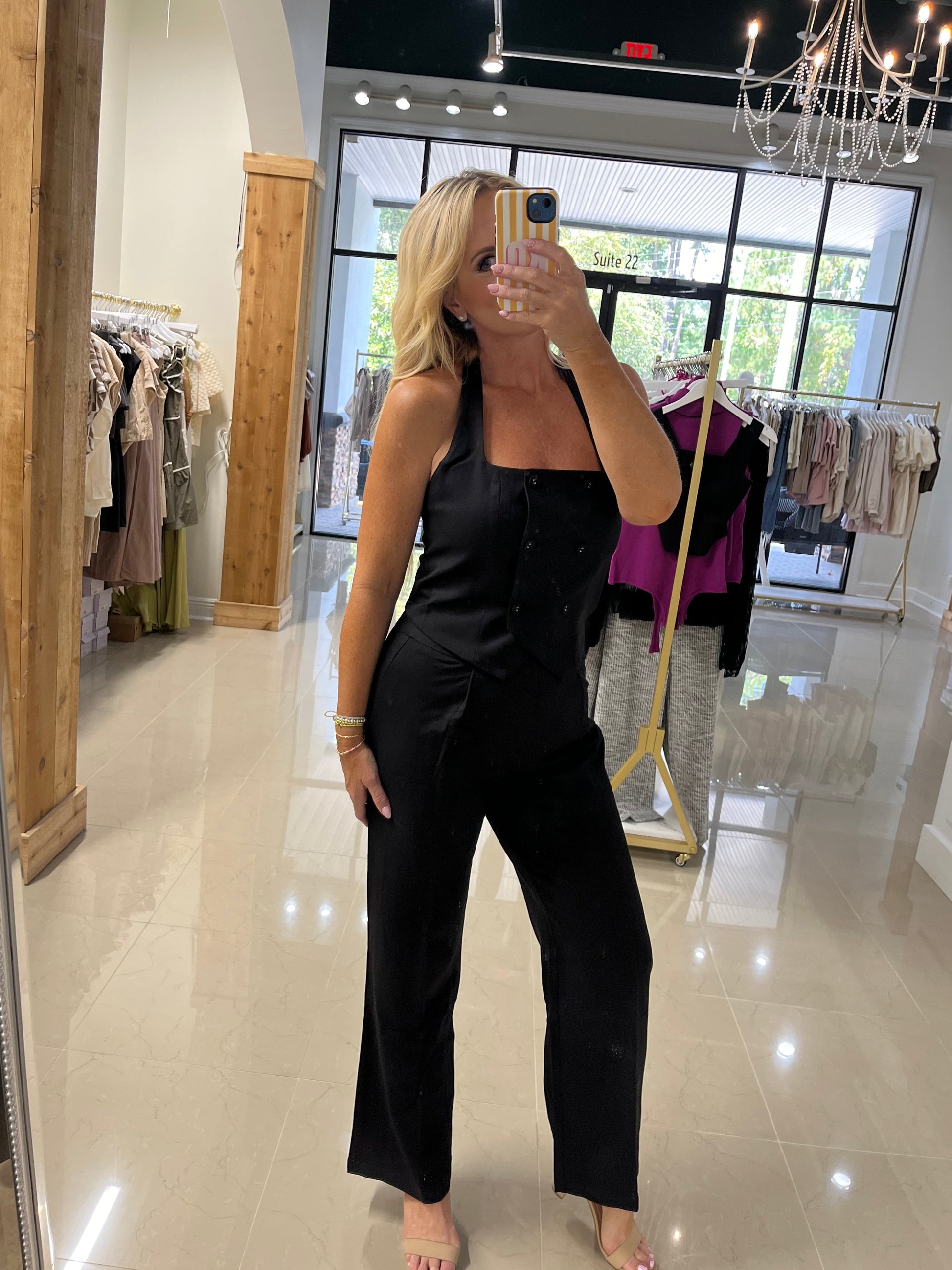 Elevate your wardrobe with this sophisticated black pant set, featuring high-waisted pants paired with a matching halter top. The design offers a flattering silhouette, combining timeless style with modern elegance for versatile day-to-night wear. Crafted for a confident fit, this set is an expert choice for effortless chic and refined comfort.