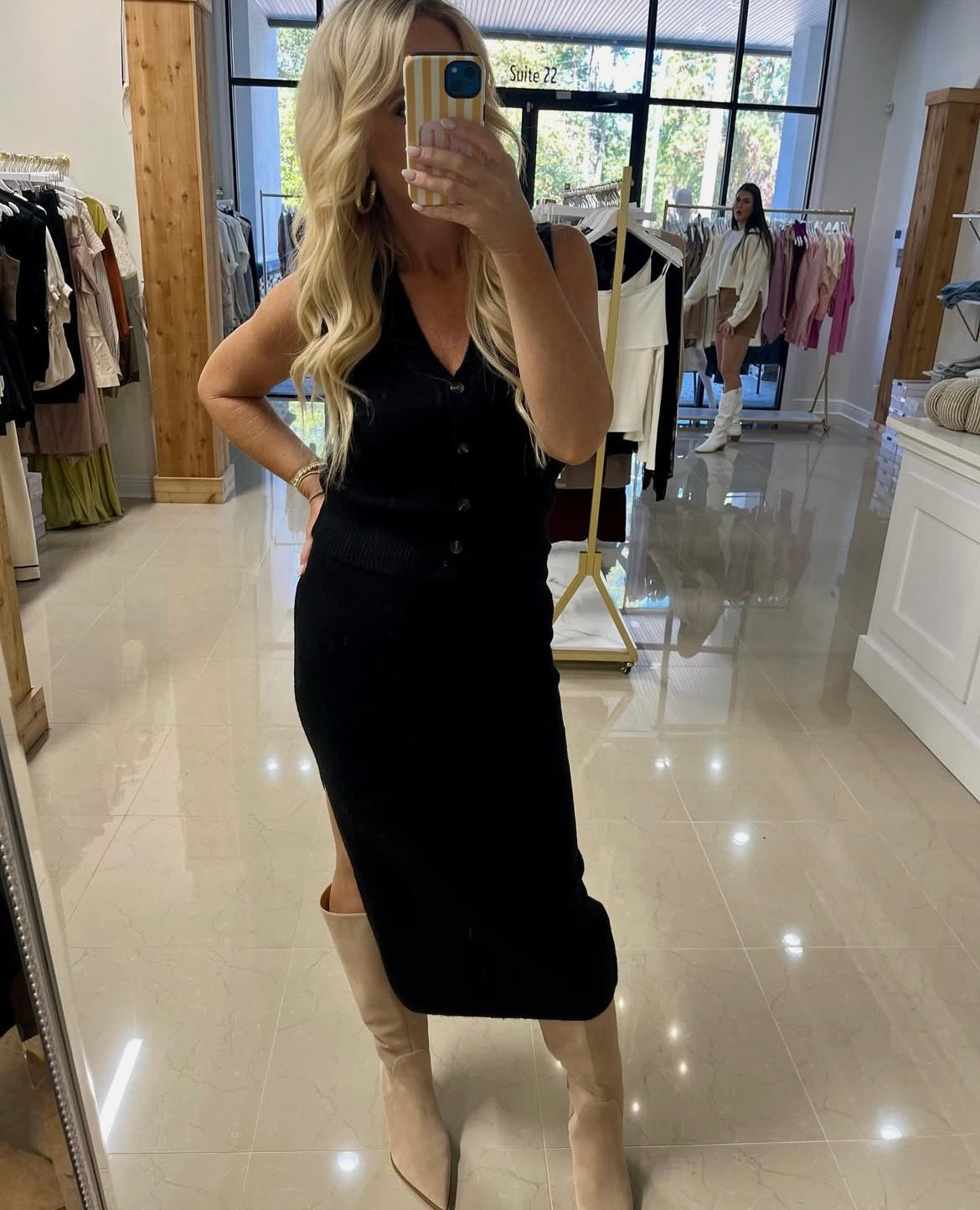 This black sweater knit vest and matching midi skirt set offers a refined blend of comfort and style. Crafted from soft, breathable knit fabric, it ensures ease of movement while maintaining a polished silhouette. The vest’s clean lines pair seamlessly with the midi skirt’s flattering length, making this set versatile for both professional settings and chic casual occasions. Ideal for layering, it provides a sophisticated, coordinated look with effortless elegance.