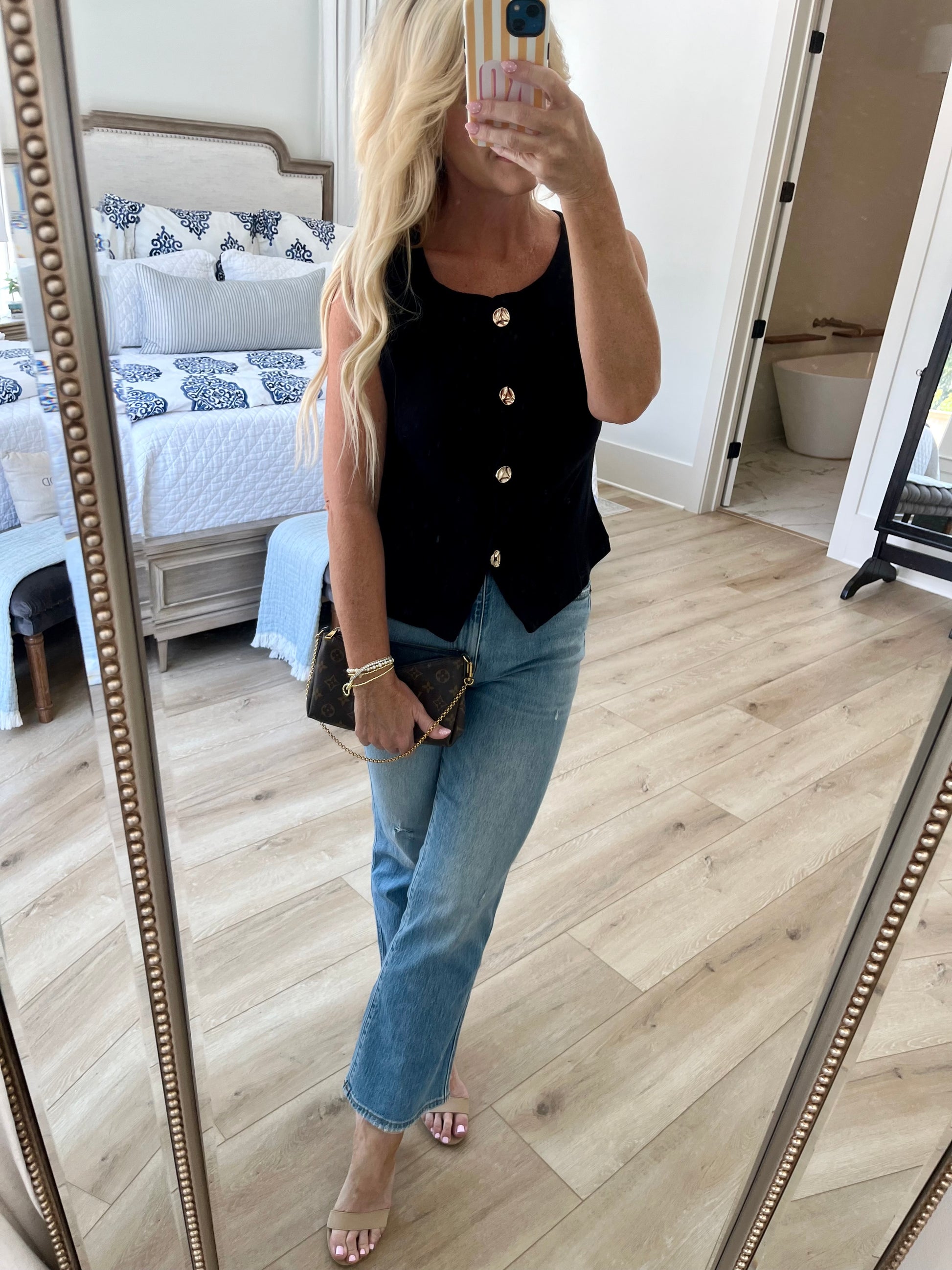 The MADDI TOP combines classic elegance with modern details, featuring a sleek black knit fabric enhanced by striking gold buttons. This design offers both comfort and a polished look, making it a versatile addition to any wardrobe. Its refined texture and subtle metallic accents create a sophisticated silhouette, perfect for professional settings or stylish casual wear.